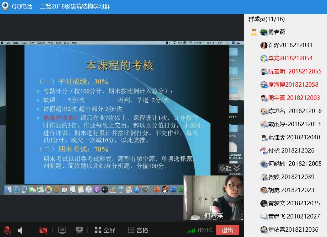 本学期傅春燕老师承担《建筑结构》和《城市规划》两门本科生课程,为了保证线上教学的效果,她专门购置了一台新电脑,并在2月初分别建立了两门课的学习群。在充分了解同学们的设备和网络现状之后,决定以成熟而简便的QQ在线教学平台为主,采用课前发学习资料,课后发教学录屏,课中的讲授和学生讨论并举的教学模式。在第一周的教学实践中,取得较好的教学效果。学生积极参与,踊跃发言,反馈良好。