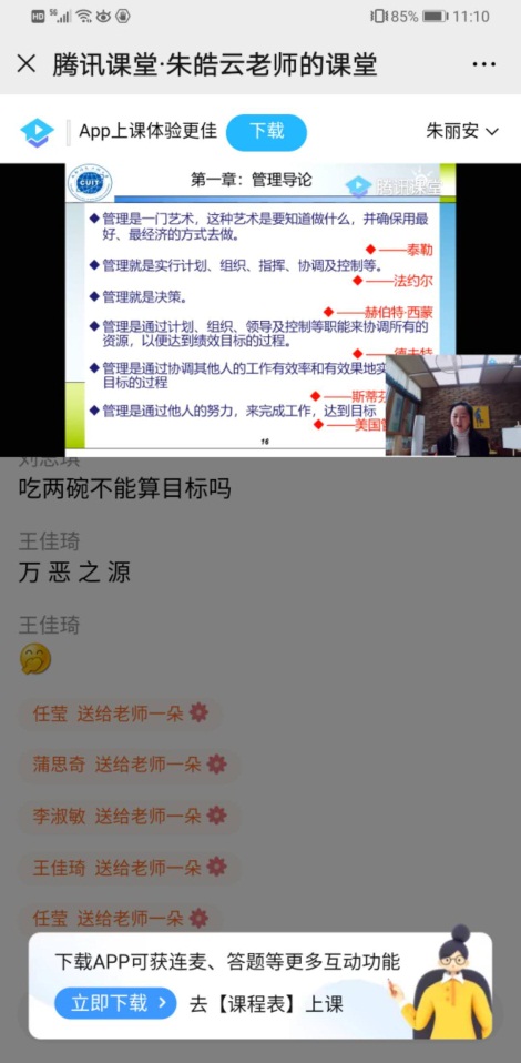 Betway体育西汉姆联电子商务系朱皓云老师承担了《管理学原理》和《写作沟通》两门本科课程。为选择一个师生适应,功能齐全的线上教学平台,朱老师先后学习了雨课堂、对分易、钉钉、腾讯会议和腾讯课堂等教学平台,并对这些平台的使用场景、功能、教学要求、网络要求、服务器稳定性等情况进行了全面的了解。在综合考虑了直播教学效果和服务器承载力之后,朱老师选择腾讯课堂作为线上教学平台。