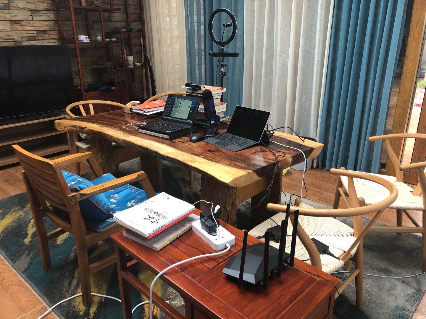 为了让学生有更好的教学体验,朱老师特地准备了专业话筒、补光灯、有线网络、备用4G网络、高质量网线、广角高清摄像头、学生端手机、备用笔记本及专门的直播场地等硬件设施。