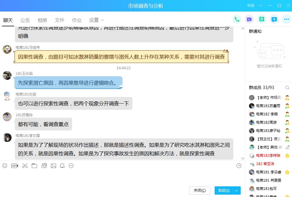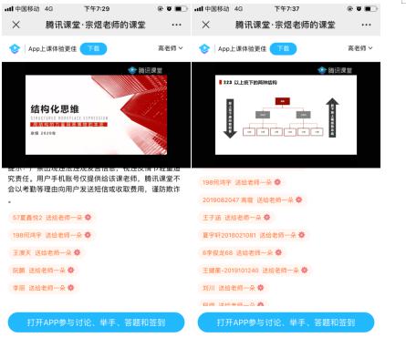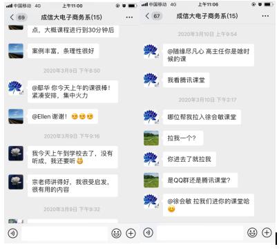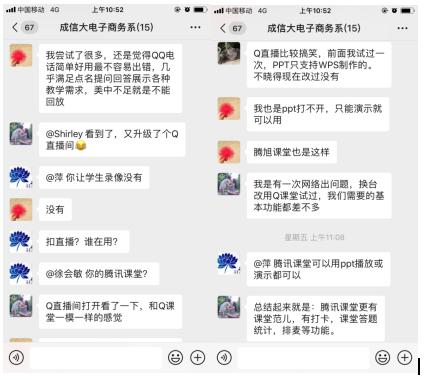 谢光明老师使用的是“QQ群直播+慕课”的线上教学方式,课堂气氛热烈,学生讨论积极。宗煜老师则使用 “腾讯课堂”进行直播教学,充分利用了“腾讯课堂”的各种教学功能,从现实案例引入,很有启发意义。