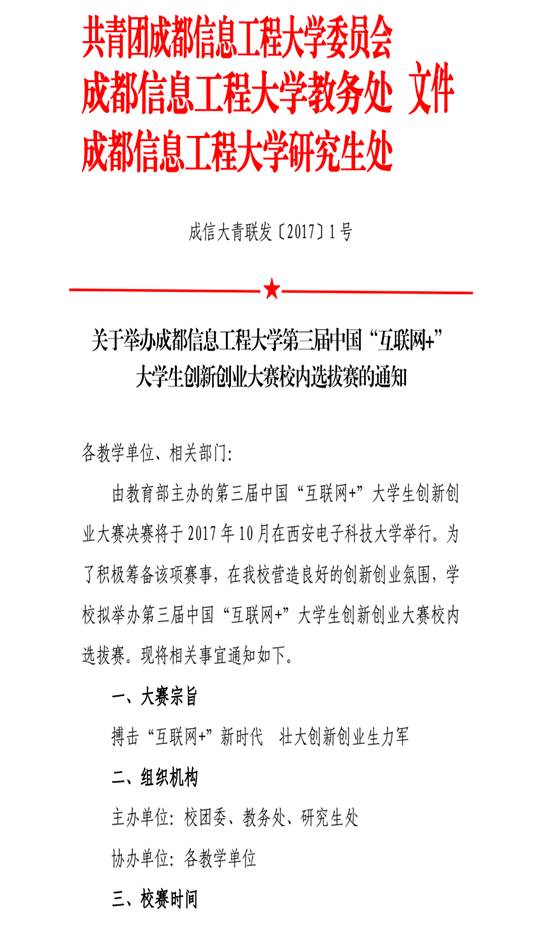 关于举办成都信息工程大学第三届中国“互联网+”大学生创新创业大赛校内选拔赛的通知