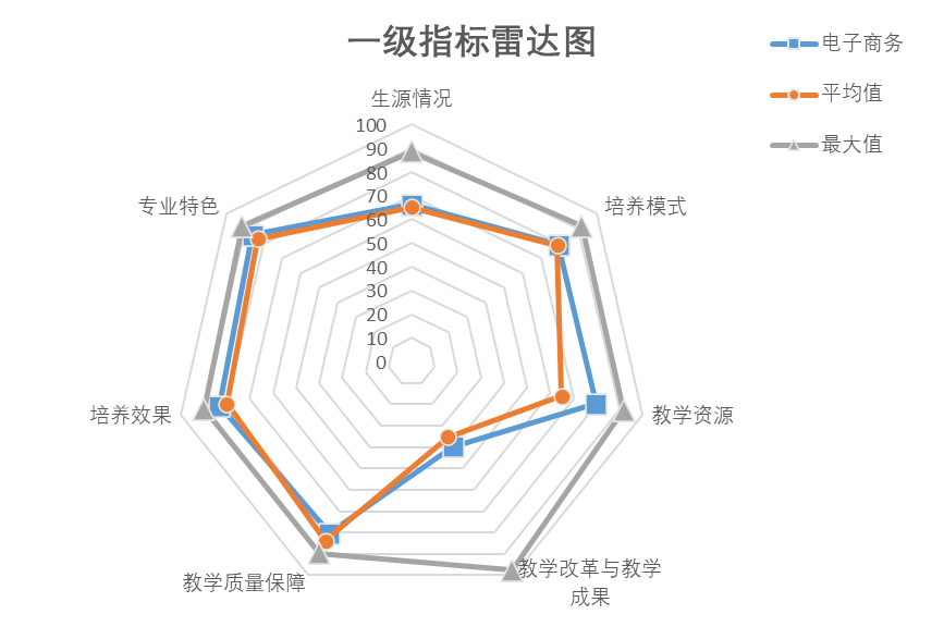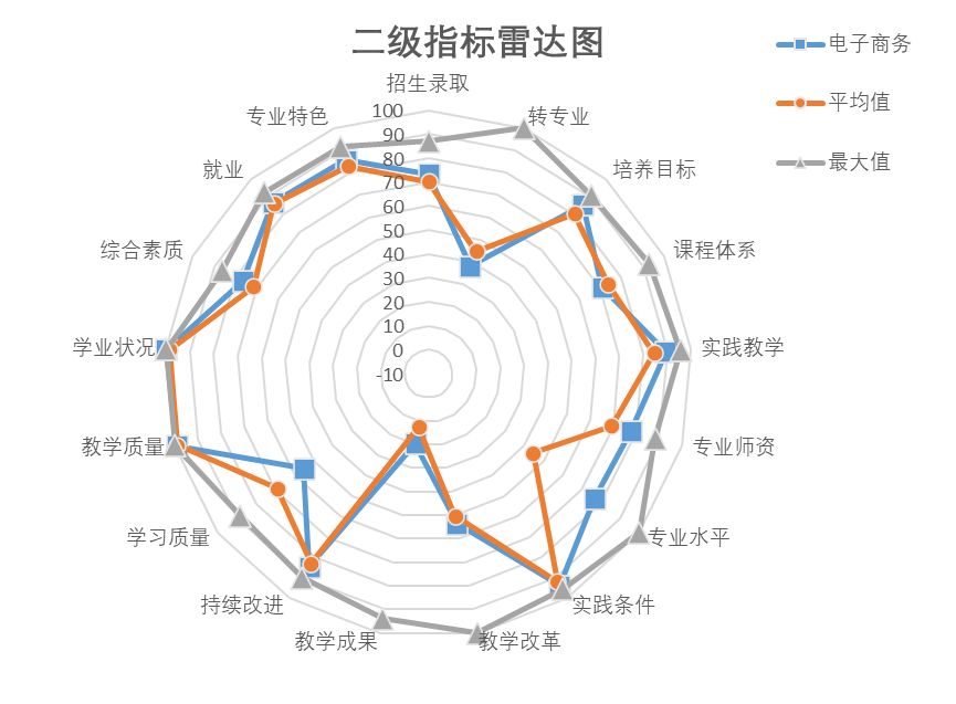 根据对一二三级指标雷达图的分析,电商专业的差距主要体现在:1.教师获得荣誉 -34;2.红黄牌警告 -29;3.教研论文 -18; 4.优质课程 -14;5.主编教材 -11;6.本科教学工程 -8;7.转专业 -6。专业需要在以上七方面加强建设。